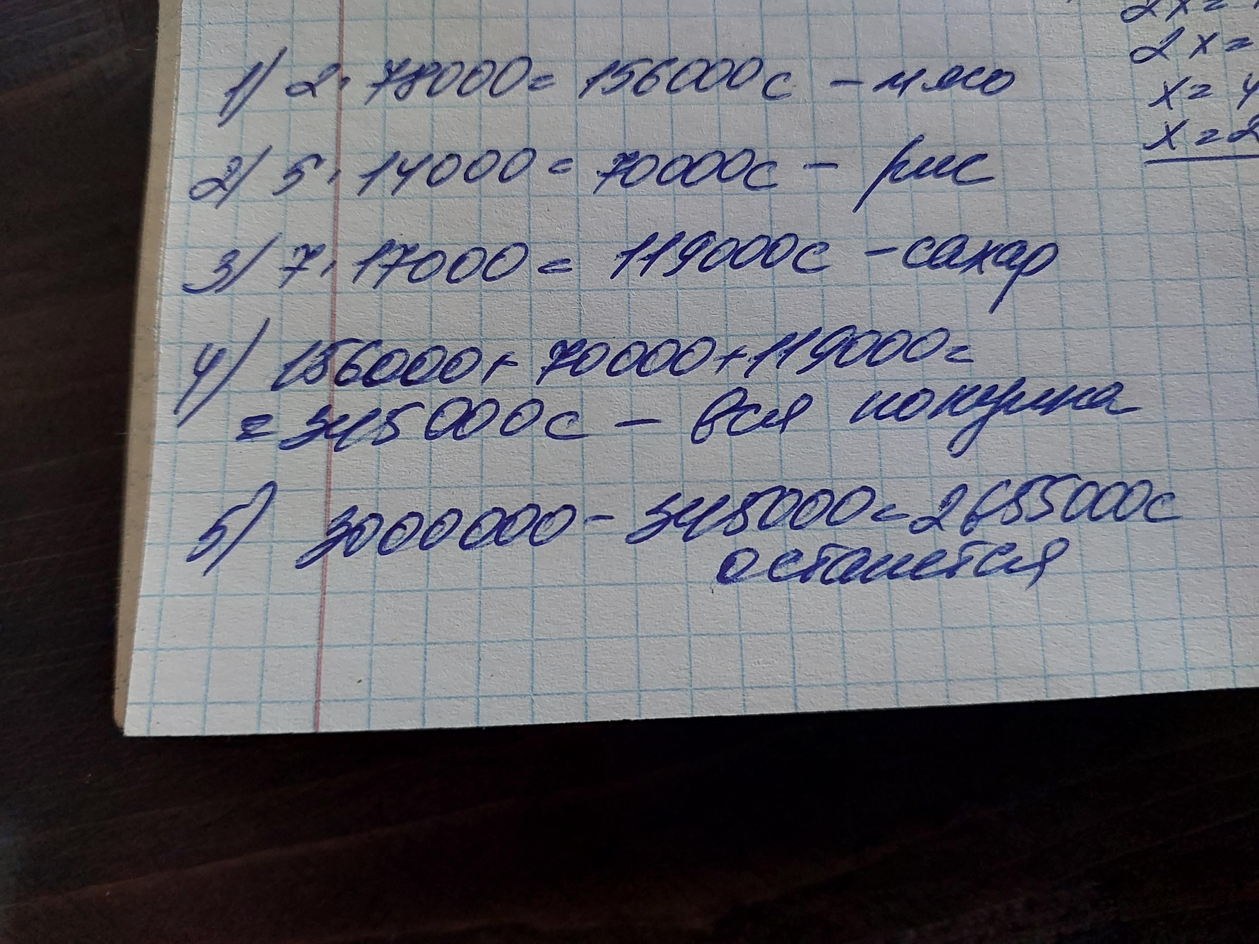 10. Фуркат ака купил на базаре 2 kg мяса по цене 78 000 сумов за килограмм, 5 kg риса по 14 000 сумов за килограмм и 7 kg сахара по цене 17 000 сумов за килограмм. Сколько денег у него останется, если с собой было 3 000 000 сум?