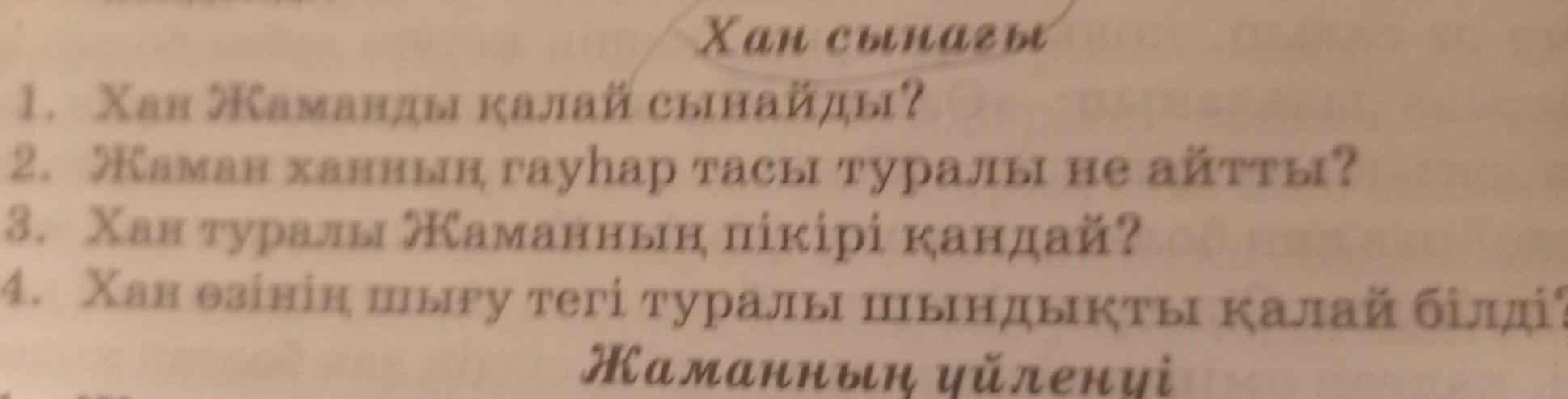 4.Жаман ханға айтады.Хан сенбей анасына айтады анасы барып бар шындықты біледі одан соң өзінің шығу тегі туралы шындықты біледі