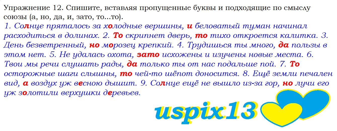 Упражнение 12. Спишите, вставляя пропущенные буквы и подходящие по смыслу союзы (а, но, да, и, зато, то...то). 1. Со...нце пряталось за х...лодные вершины, (?) беловатый туман начинал расходиться в долинах. 2. (?) скрипнет дверь, (?) тихо откроется калитка. 3. День безветренный, (?) м...розец крепкий. 4. Трудишься ты много, (?) пользы в этом нет. 5. Не удалась охота, (?) ис- хожены и изучены новые места. 6. Твои мы речи слушать рады, (?) только ты от нас подальше пой. 7. (?) осторожные шаги слышны, (?) чей-то шёпот доно- сится. 8. Ещё земли печален вид, (?) воздух уж в...сною дышит. 9. Со...нце ещё не вышло из-за гор, (?) лучи его уж з...лотили верхушки д...ревьев. V