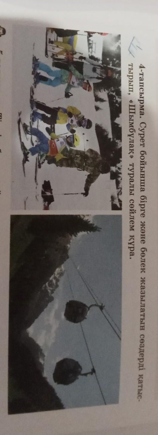. Бұл мәтіннен кандай ақпарат алдын? Белек және бiрге жазылған сөздерді жаз. 4-тапсырма. Сурет бойынша бiрге және белек жазылатын сөздерді қатыс- тырып, «Шымбұлақ» туралы сөйлем құра.