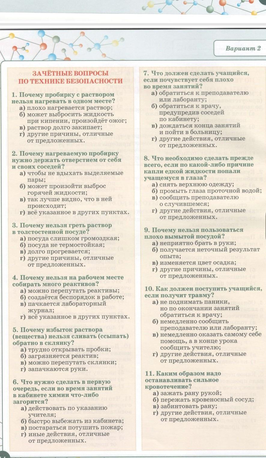 14 ЗАЧЁТНЫIE BOПPOCы ПО ТЕХНИКЕ БЕЗОПАСНОСТИ 1. Почему пробирку с раствором нельзя нагревать в одном месте? a) плохо нагревается раствор; б) может выбросить жидкость при кипении, произойдёт ожог; в) раствор долго закипает; г) другие причины, отличные от предложенных. 2. Почему нагреваемую пробирку нужно держать отверстием от себя и своих соседей? a) чтобы не вдыхать выделяемые пары; б) может произойти выброс горячей жидкости; в) так лучше видно, что в ней происходит; г) всё указанное в других пунктах. 3. Почему нельзя греть раствор в толстостенной посуде? a) посуда слишком громоздкая; б) посуда не термостойкая в) долго прогревается; г) другие причины, отличные от предложенных. 4. Почему нельзя на рабочем месте собирать много реактивов? a) можно перепутать реактивы; б) создаётся беспорядок в работе; в) пачкается лабораторный журнал; г) всё указанное в других пунктах. 5. Почему избыток раствора (вещества) нельзя сливать (ссыпать) обратно в склянку? a) трудно открывать пробки; б) загрязняется реактив; в) можно перепутать склянки; г) запачкаются руки. 6. Что нужно сделать в первую очередь, если во время занятий в кабинете химии что-либо загорится? a) действовать по указанию учителя; б) быстро выбежать из кабинета; в) постараться потушить пожар; г) иные действия, отличные от предложенных. Вариант 2 7. Что должен сделать учащийся, если почувствует себя плохо во время занятий? а) обратиться к преподавателю или лаборанту; б) обратиться к врачу, опредупредив соседей по кабинету; в) дождаться конца занятий и пойти в больницу; г) другие действия, отличные от предложенных. 8. Что необходимо сделать прежде всего, если по какой-либо причине капли едкой жидкости попали учащемуся в глаза? а) снять верхнюю одежду; б) промыть глаза проточной водой; в) сообщить преподавателю о случившемся; г) другие действия, отличные от предложенных. 9. Почему нельзя пользоваться плохо вымытой посудой? а) неприятно брать в руки; б) получается неточный результат опыта; в) изменяется цвет осадка; г) другие причины, отличные от предложенных. 10. Как должен поступить учащийся, если получит травму? a) не поднимать паники, но по окончании занятий обратиться к врачу; б) немедленно сообщить преподавателю или лаборанту; в) немедленно оказать самому себе помощь, а в конце урока сообщить учителю; г) другие действия, отличные от предложенных. (0 98- с 11. Каким образом надо останавливать сильное кровотечение? a) зажать рану рукой; б) пережать кровеносный сосуд; в) забинтовать рану; г) другие действия, отличные от предложенных.