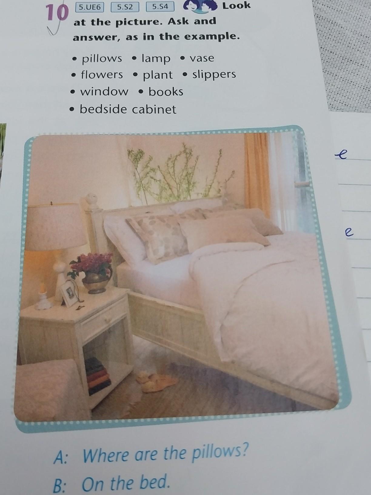 ។ 10 there Speaking Describing location 5.UE6 5.52 at the picture. Ask and answer, as in the example. • pillows lamp vase flowers. plant • slippers • window • books bedside cabinet 5.54 Look e e some work