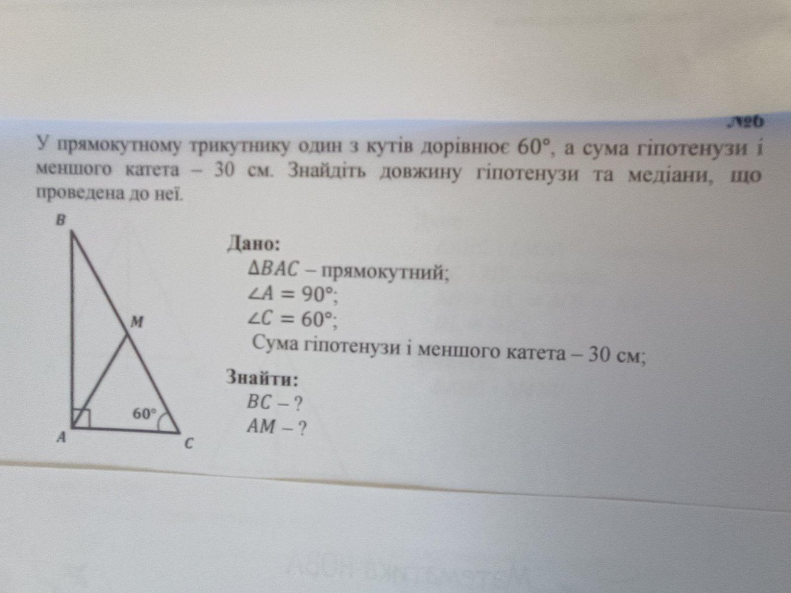 У прямокутному трикутнику один з кутів дорівнює 60°, а сума гіпотенузи і меншого катета - 30 см. Знайдіть довжину гіпотенузи та медіани, що проведено до неї
