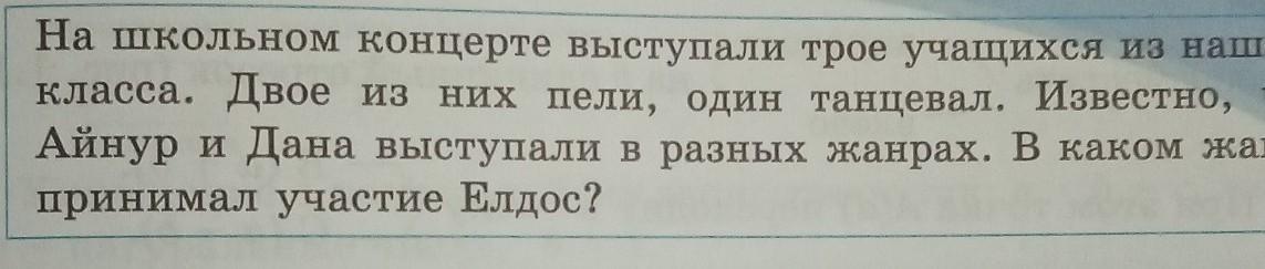 нам известно,что всего было трое детей. двое пели и один танцевал. дальше мы узнаем,что Айнур и Дана выступали в разных направлениях(кто-то танцевал, кто-то пел). в соответствии с этим нам становится известным единственный танцующий человек, а следовательно остальные два поют(кто-то из девочек и Елдос).