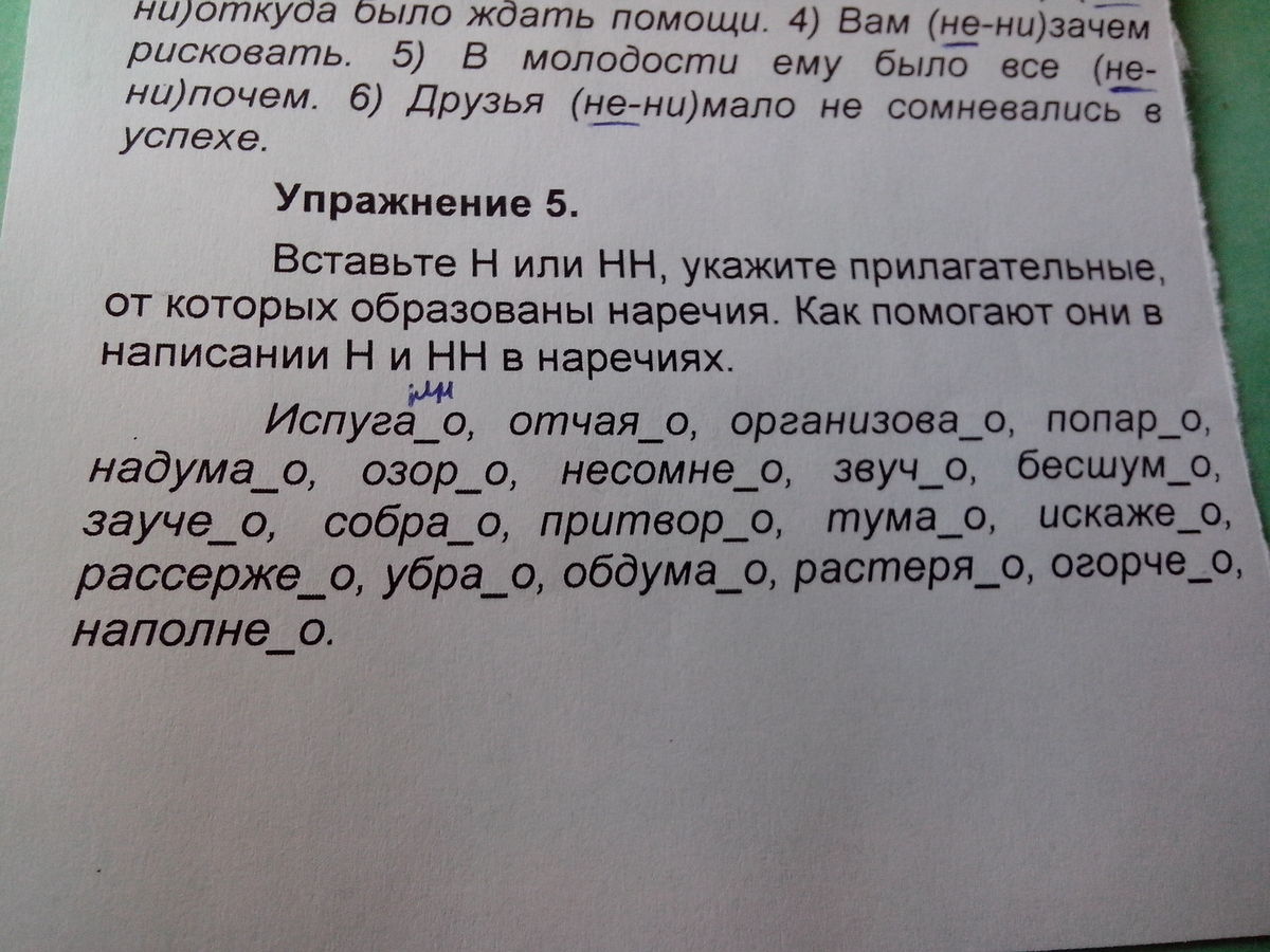 организованно-организованный, попарно-попарный, надуманно-надуманный, озорно-озорной, несомненно-несомненный, звучно-звучный, бесшумно-бесшумный, заученно-заученный, собранно-собранный, притворно-притворный, туманно-туманный, искаженно-искаженный, рассерженно-рассерженный, убрано-убранный, обдуманно-обдуманный, растерянно-растерянный, огорченно-огорченный, наполненно -наполненный. сколько н в прилагательном, столько и в наречии
