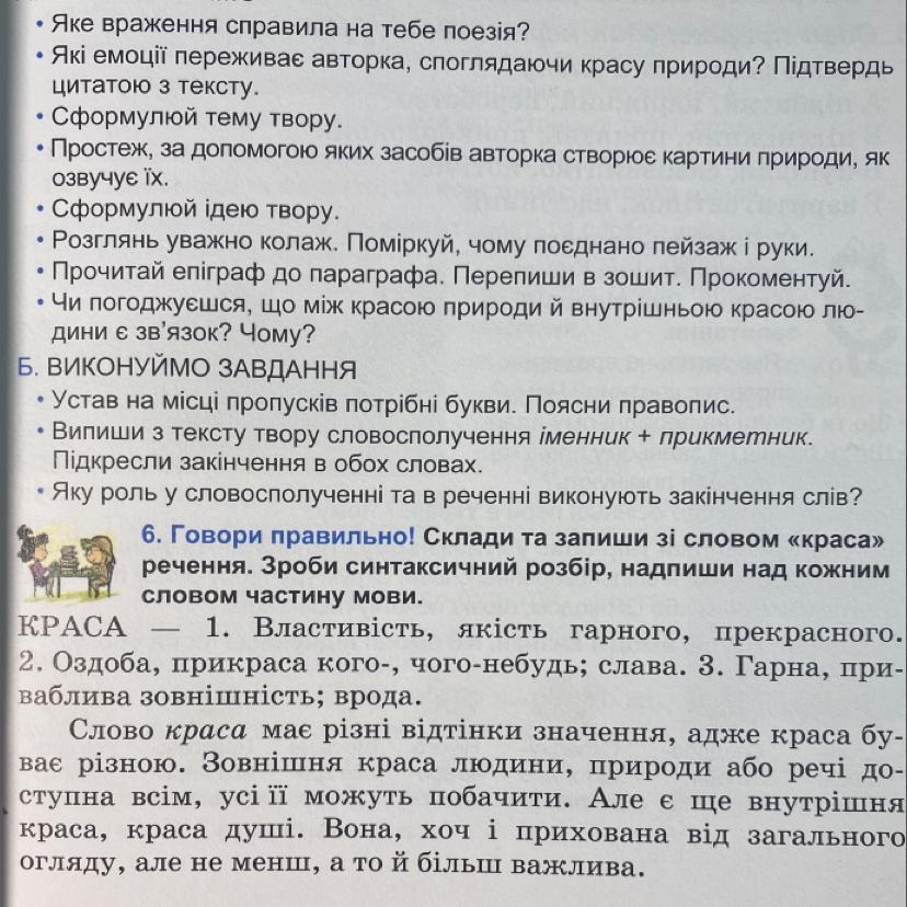 Осіння(означення, прикметник) пора(підмет, іменик) красу(додаток, іменик) на(прийменик) довкілля(обставина, іменик) принесла(присудок, дієслово).