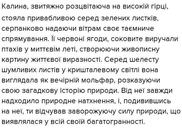 Калина, звитяжно розцвітаюча на високій гірці, стояла привабливою серед зелених листків, серпанково надаючи вітрам своє таємниче спрямування. Її червоні ягоди, соковите виручали птахів у миттєвім леті, створюючи живописну картину життєвої виразності. Серед шелесту шумливих листів у кришталевому світлі вона виглядала як вечірній мольфар, розказуючи свою загадкову історію природи. Від неї завжди надходило природне натхнення, і, подивившись на неї, ти відчував заворожуючу силу природи, що виявлялася у всій своїй багатогранності.