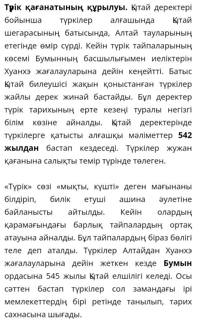 Түрік қағанатының құрылуы. Қытай деректері бойынша түркілер алғашында Қытай шегарасының батысында, Алтай тауларының етегінде өмір сүрді. Кейін түрік тайпаларының көсемі Бумынның басшылығымен иеліктерін Хуанхэ жағалауларына дейін кеңейтті. Батыс Қытай билеушісі жақын қоныстанған түркілер жайлы дерек жинай бастайды. Бұл деректер түрік тарихының ерте кезеңі туралы негізгі білім көзіне айналды. Қытай деректерінде түркілерге қатысты алғашқы мәліметтер 542 жылдан бастап кездеседі. Түркілер жужан қағанына салықты темір түрінде төлеген.