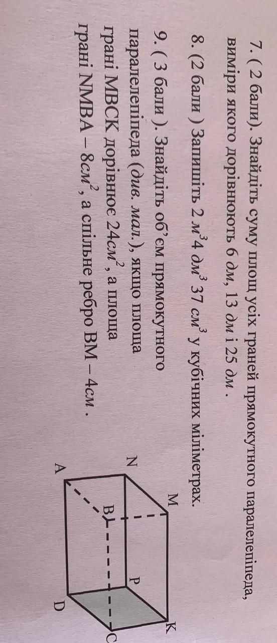 7. Спершу знайдемо площу кожної з граней прямокутного паралелепіпеда. Для грані зі стороною 6 дм × 13 дм площа буде 6 дм × 13 дм = 78 дм². Для грані зі стороною 6 дм × 25 дм площа буде 6 дм × 25 дм = 150 дм². Для грані зі стороною 13 дм × 25 дм площа буде 13 дм × 25 дм = 325 дм².