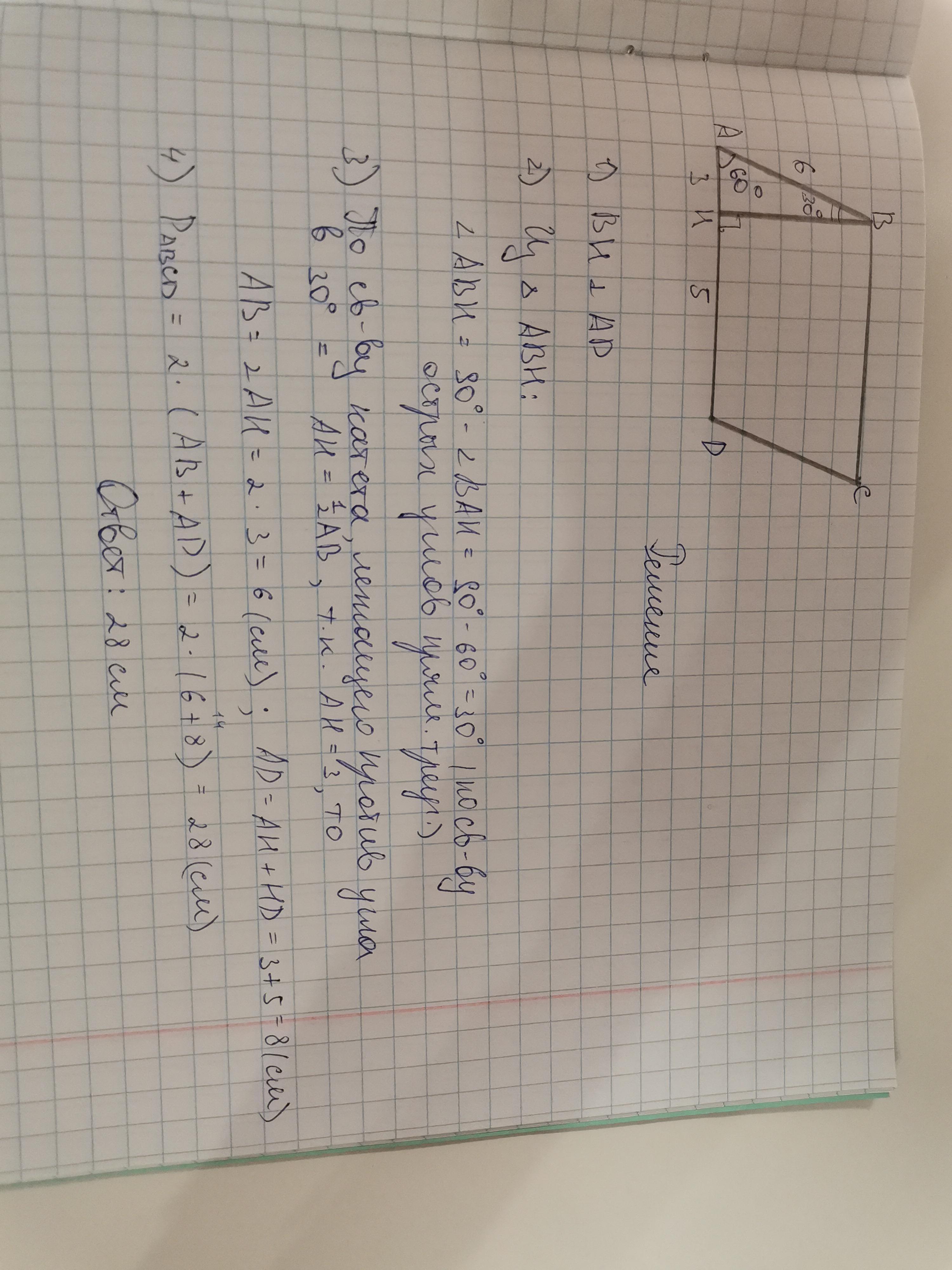 у паралелограм гострий кут 60°, висота проведена з вершини тупого кута ділить протилежну сторону на відрізки 3 і 5 см починаючи з вершини гострого кута знайти периметр