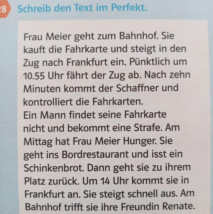 Frau Meier ist zum Bahnhof gegangen. Sie hat die Fahrkarte gekauft und ist in den Zug nach Frankfurt eingestiegen. Pünktlich um 10.55 Uhr hat der Zug abgefahren. Nach zehn Minuten ist der Schaffner gekommen und hat die Fahrkarte kontrolliert. Ein Mann hat seine Fahrkarte nicht gefunden und hat eine Strafe bekommt. Am Mittag hatte Frau Meier Hunger. Sie ist ins Bordrestaurant gegangen und hat ein Schinkelbrot gegessen. Dann ist sie zu ihrem Platz zurückgegangen. Um 14 Uhr ist sie in Frankfurt angekommen. Sie ist schnell ausgestiegen. Am Bahnhof hat sie ihre Freundin Renate getroffen.