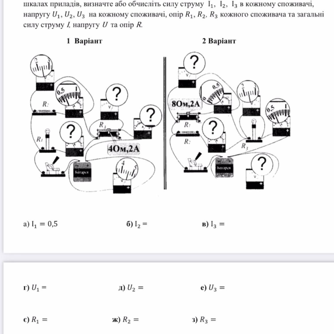 Під час вивчення законів послідовного і паралельного зʼєднання учень склав електричне коло, зображене на малюнку . Використовуючи результати вимірювань, відображені на шкалах приладів, визначте або обчисліть силу струму 1, 12, Із в кожному споживачі, напругу U, U2, Uz на кожному споживачі, опір R1, R2. R3 кожного споживача та загальні силу струму 1, напругу U та опір R.