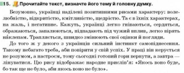 Темою цього тексту являється розповідь про українців.Розповідається про їхні риси характеру,вчинки.Головною думкою тексту являється донести до читача історію роду українського.Відкрити глибокі ,сильні сторони українського народу.