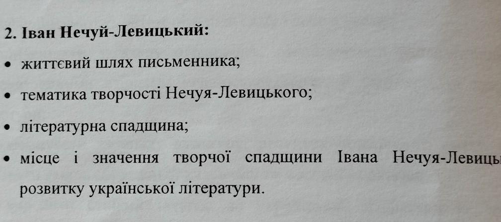 Життєний шлях писателя:Іван Нечуй-Левицький народився 13 (25) лютого 1838 року в селі Білки, що на Львівщині, яка на той час була частиною Галичини, а тепер України.Він навчався в Перемишльському та Львівському університетах, де отримав юридичну освіту.Нечуй-Левицький працював у різних юридичних посадах, але більше слави здобув як літературний діяч.Тематика творчості Нечуя-Левицького:Його творчість відзначалася глибоким патріотизмом і образливим ставленням до соціальної несправедливості.