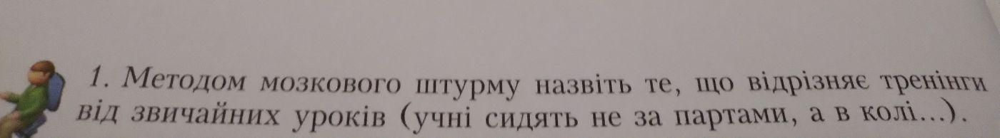 Відповідь: Тренінг відрізняється від звичайного уроку тим, що орієнтується не на правильну відповідь, а на запитання та пошук