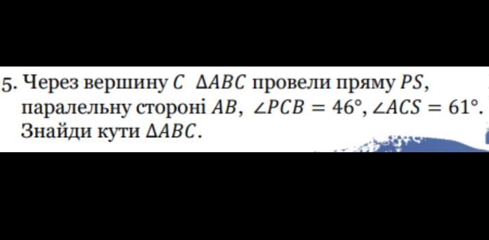 Кут PCB = 46 градусів - це кут між стороною BC і прямою PS. Тому, що PS паралельна AB, то кут PCB також є внутрішнім кутом трикутника ABC, і ми можемо позначити його як кут B: ∠B = 46 градусів.
