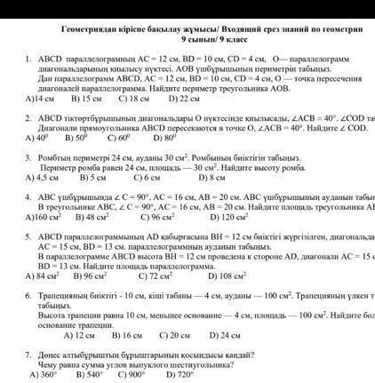 1. ABCD параллелограмнын АС = 12 см, BD = 10 см, CD=4 см, о- параллелограмм