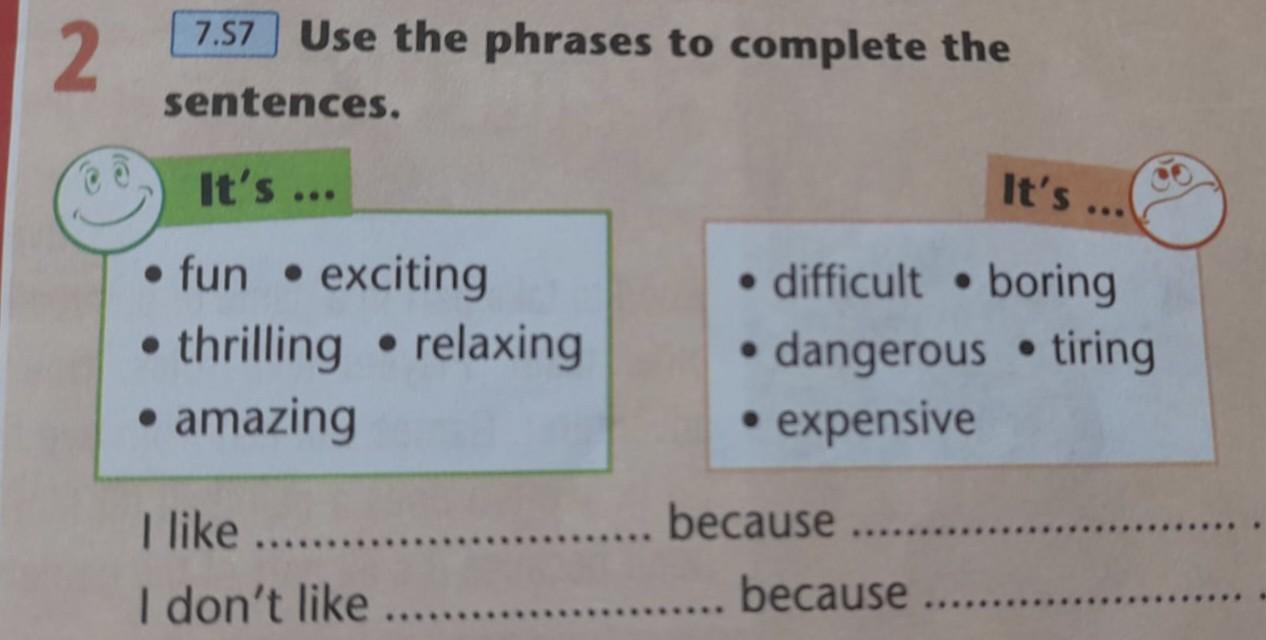 2 7.57 Use the phrases to complete the sentences. It's... • fun. exciting thrilling • amazing • relaxing I like. I don't like ....... ...... because It's difficult boring dangerous tiring • expensive because ...