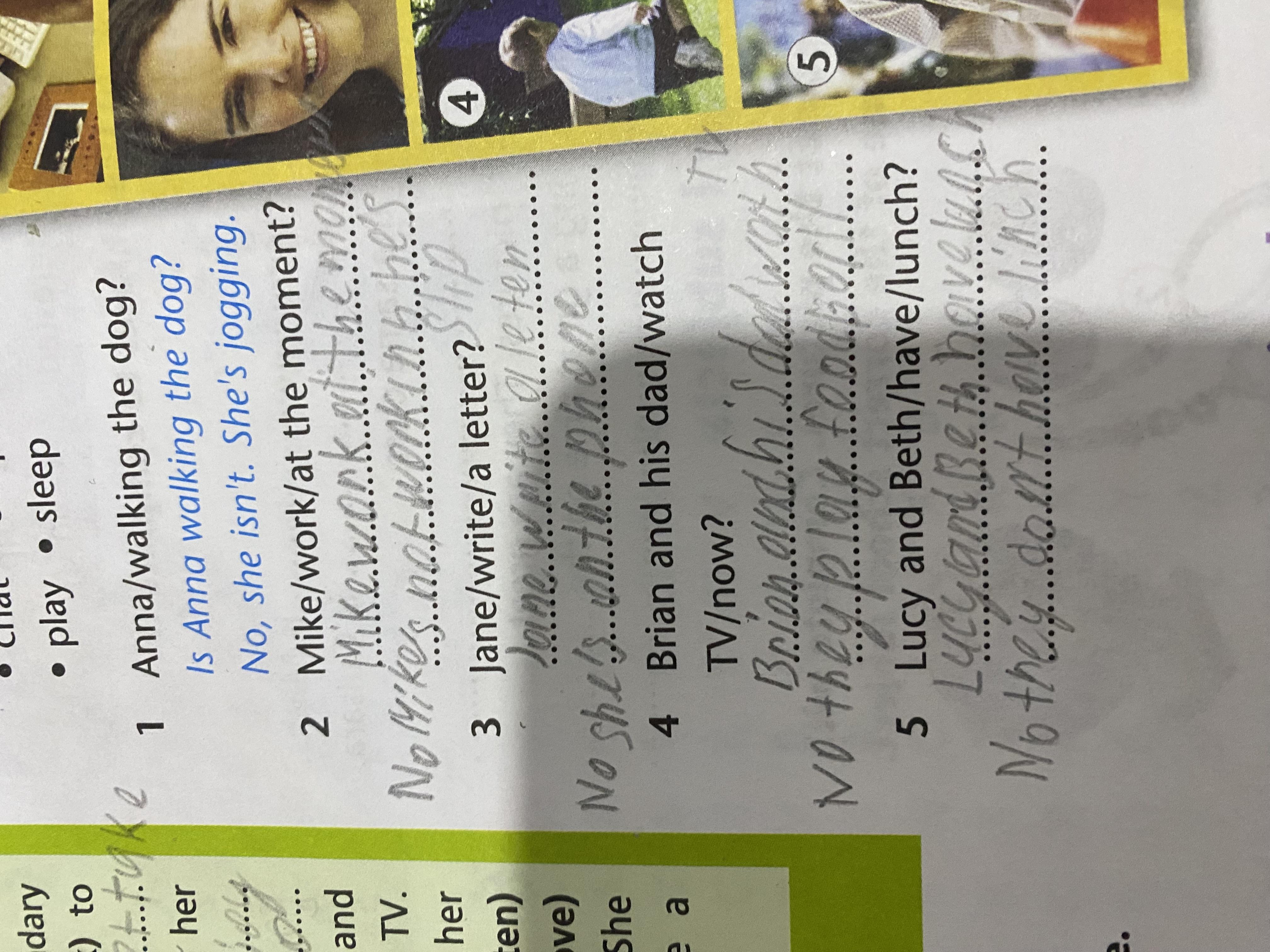 3 • Present continuous Use the verbs to write questions and answers, as in the example. chat shop jog . • play sleep . 1 Anna/walking the dog? Is Anna walking the dog? No, she isn't. She's jogging. 2 Mike/work/at the moment? Tam leaking for a ...hew...book 3 Jane/write/a letter? 4 Brian and his dad/watch TV/now? 5 Lucy and Beth/have/lunch? Pre