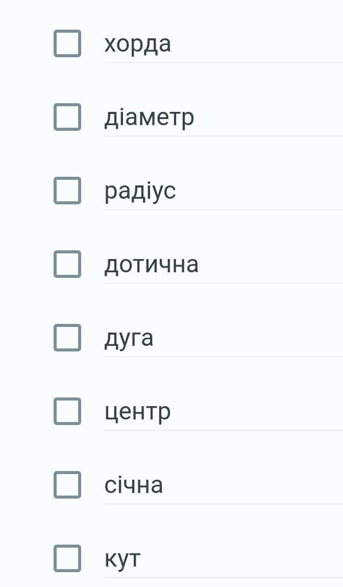 Оберіть всі прямі та відрізки, які є у колі чи поза ним хорда діаметр радіус дотична дуга центр січна