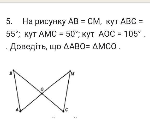 Оскільки в трикутнику АВО <АВ0=55°, а <АОВ=<МОС, як вертикальні, то <ВА0=50°. За умовою АВ=МС, тоді за другою ознакою (за стороною і двома прилеглими кутами) трик.АВО=трик.МСО.