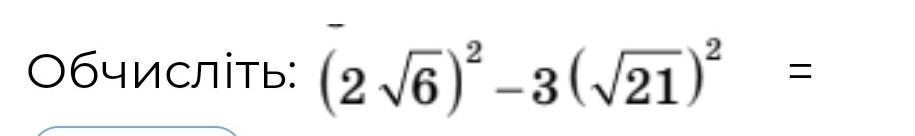 Обчисліть: (2 /6)²-3(/21)² (√21) || =