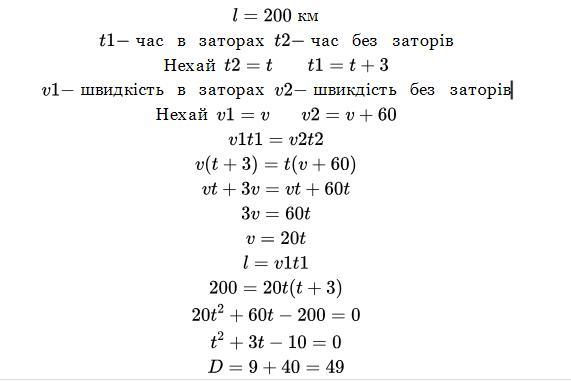 Відстань від будинку до дачi по шосе становить 200 км. Рухаючись автомобілем но без заторів, сім'я добирається до дачі на 3 год швидше, постiйною швидкістю в заторах. Яка швидкість автомобіля нкщо по дорозі із заторами вона на 60 км/год менша, ніж 1 бал)