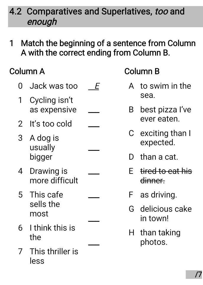 4.2 Comparatives and Superlatives, too and enough 1 Match the beginning of a sentence from Column A with the correct ending from Column B. Column A Column B 0 Jack was too _E 1 Cycling isn't as expensive 2 It's too cold 3 A dog is usually bigger 4 Drawing is more difficult 5 This cafe sells the most 6 I think this is the 7 This thriller is less A to swim in the sea. B best pizza I've ever eaten. C exciting than I expected. D than a cat. E tired to eat his dinner. F as driving. G delicious cake in town! H than taking photos.