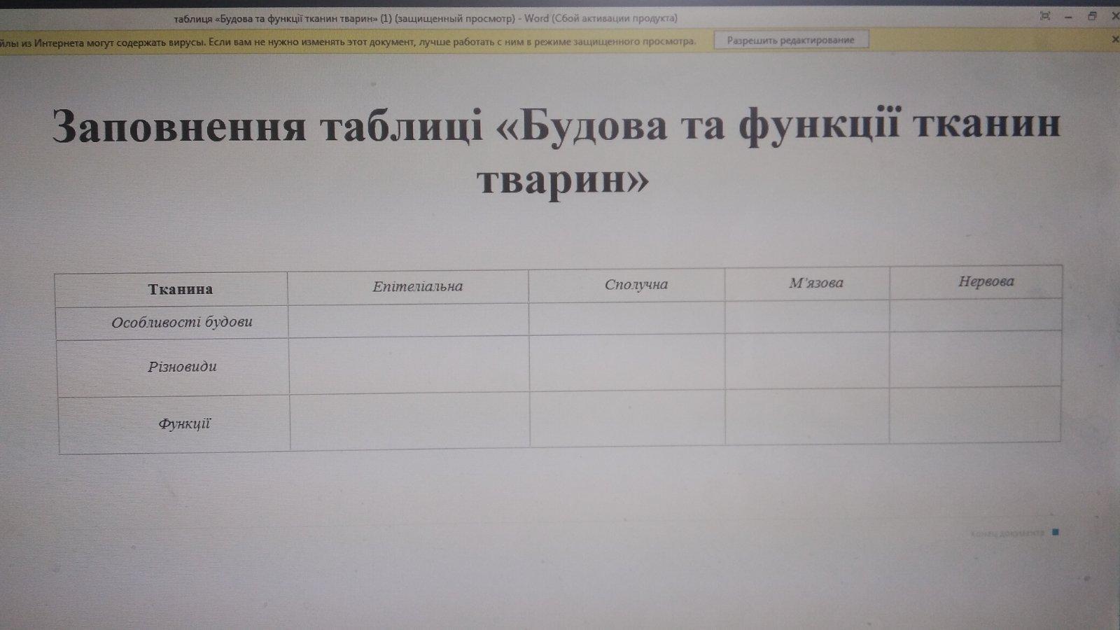Заповнити таблицю "«Будова та функції тканин тварин»".