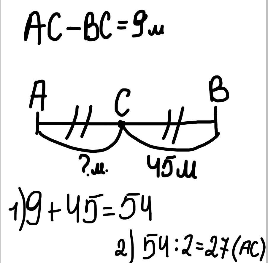 Точка С лежит между точками А и В, АВ=45 м. Найдите длину отрезка АС, если известно что AC-BC=9 м. С РИСУНКО ДАЮ 25 БАЛОВ
