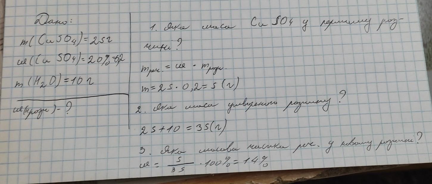 у розчині мідного купоросу масою 25г з масовою часткою 20% додали 10г води. Визначте масову частку в новому розчині.