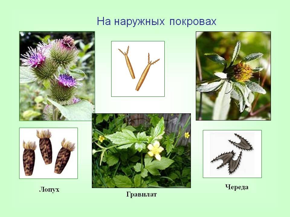 У семян репейника есть специальные крючочки, у шиповника - колючки. Ими они цепляются за перья птиц и шерсть животных, и переносятся на большие расстояния.