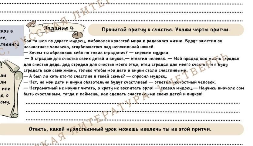 Задание 4 а Прочитай притчу о счастье. Укажи черты притчи. Как-то шел по дороге мудрец, любовался красотой мира и радовался жизни. Вдруг заметил он несчастного человека, сгорбившегося под непосильной ношей. Зачем ты обрекаешь себя на такие страдания? спросил мудрец. Я страдаю для счастья своих детей и внуков,- ответил человек. Мой продед всю жизнь страдал для счастья деда, дед страдал для счастья моего отца, отец страдал для моего счастья и я буду страдать всю свою жизнь, только чтобы мои дети и внуки стали счастливыми А был ли хоть кто-то счастлив в твоей семье? спросил мудрец. Нет, но мои дети и внуки обязательно будут счастливы! - ответип несчастный человек. - Неграмотный не научит читать, а кроту не воспитать орла! - сказал мудрец. быть счастливым, тогда и поймешь, как сделать счастли сыми своих детей и внуков! проблеми в еки - Ответь, какой ТАЯ - - Научись вначале сам урок можешь извлечь ты из этой притчи.