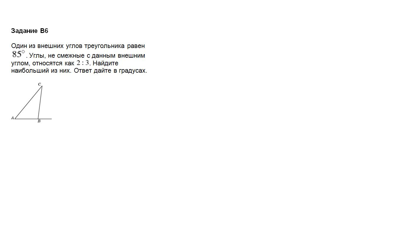 Внешний угол треугольника равен сумме двух других углов не смежных с ним. Эти два угла в сумме составляют 85 град. и на них приходится 2+3=5 частей, на больший угол 3 части, т.е. 85:5*3=51 град.