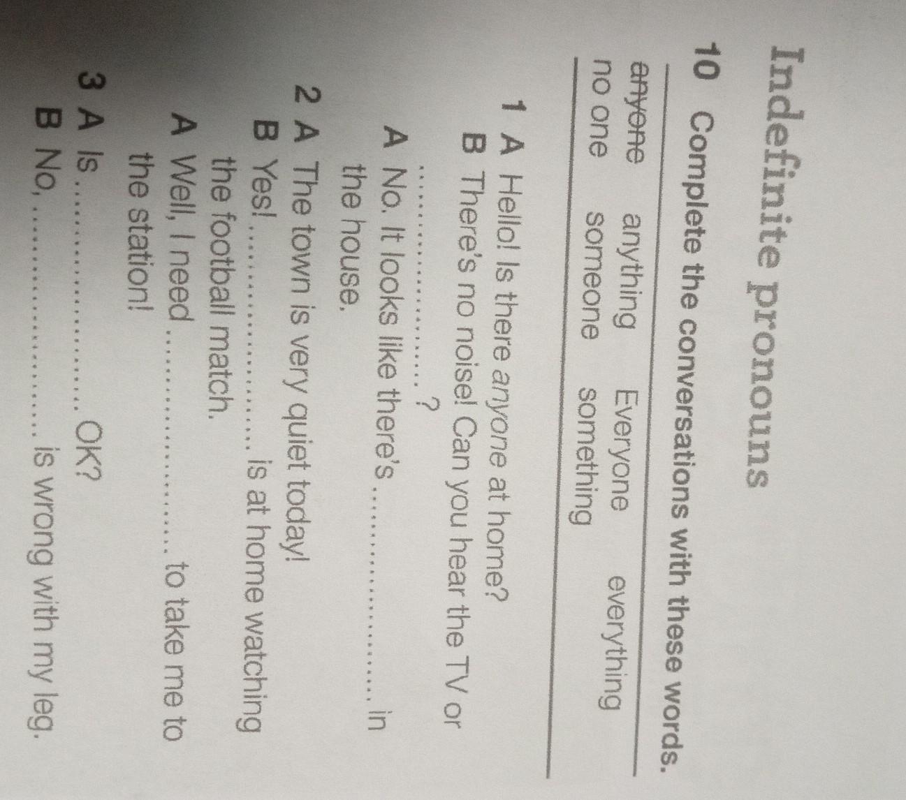 Indefinite pronouns 10 Complete the conversations with these words. everything anyone anything Everyone someone something no one 1 A Hello! Is there anyone at home? B There's no noise! Can you hear the TV or ? ..... in A No. It looks like there's.. the house. 2 A The town is very quiet today! B Yes! ........... the football match. A Well, I need .......... the station! 3 A Is....... .... is at home watching B No, ........ ... OK? ...... to take me to is wrong with my leg.