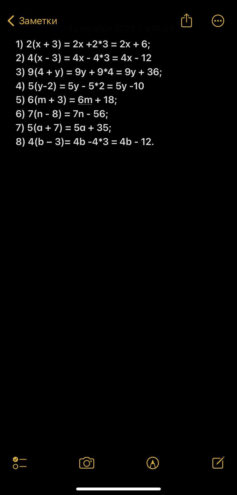 А 66. Применяя распределительное свойство умножения, данные произведения запишите в виде суммы, разности: 1) 2(x + 3); 3) 9(4 + y); 5) 6(m + 3); 2) 4(x - 3); 4) 5(y-2); 6) 7(n - 8); 7) 5(a + 7); 8) 4(b − 3).