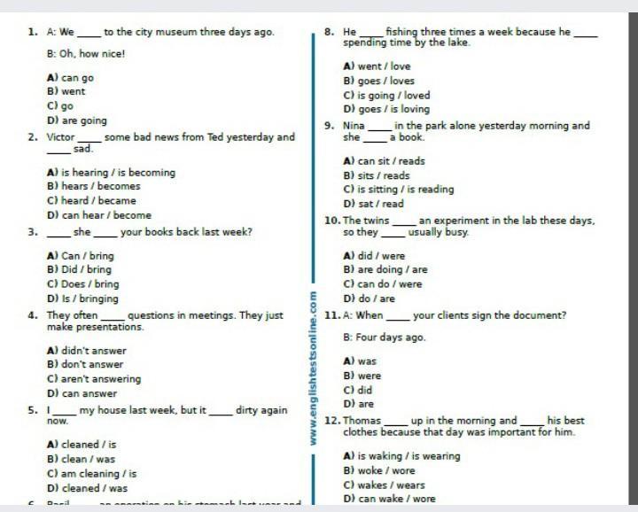 памогите умоляю 1. A: We B: Oh, how nice! 2. Victor A) can go B) went C) go D) are going to the city museum three days ago. C sad. A) is hearing / is becoming B) hears/becomes C) heard / became D) can hear / become 3. she___ your books back last week? some bad news from Ted yesterday and A) Can / bring B) Did / bring C) Does / bring D) Is / bringing 4. They often questions in meetings. They just make presentations. 5. I A) didn't answer B) don't answer C) aren't answering D) can answer now. my house last week, but it dirty again A) cleaned / is B) clean / was C) am cleaning / is D) cleaned / was tion on bir www.english testsonline.com 8. He spending time by the lake. A) went / love B) goes / loves C) is going / loved D) goes / is loving 9. Nina she fishing three times a week because he A) can sit / reads B) sits / reads C) is sitting / is reading D) sat/read in the park alone yesterday morning and a book. 10. The twins so they 11. A: When A) did / were B) are doing / are C) can do / were D) do / are A) was B) were C) did D) are an experiment in the lab these days. usually busy. your clients sign the document? B: Four days ago. 12. Thomas up in the morning and his best clothes because that day was important for him. A) is waking / is wearing B) woke / wore C) wakes / wears D) can wake/wore
