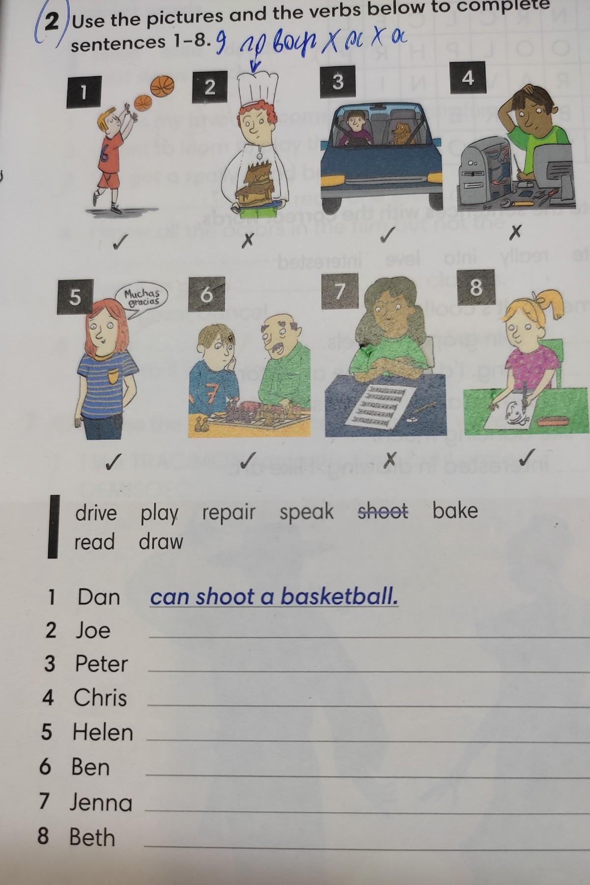 2 Use the pictures and the verbs below to complete sentences 1-8. 2 3 1 5 Muchas gracias X 7 1 2 Joe 3 Peter 4 Chris 5 Helen 6 Ben 7 Jenna 8 Beth X Dan can shoot a basketball. 4 drive play repair speak sheet bake read draw 8 X