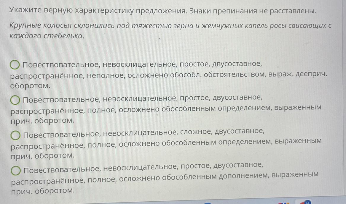 ~Крупные~ —колосья— =склонились= (- -под - -тяжестью - -зерна- -) и ~жемчужных~ (- -капель- - росы- -),|~ свисающих с каждого стебелька~|. (повествовательное, невосклицательное, простое, распространённое, двусоставное, полное, осложнено обособленным определением, выраженным причастным оборотом, и однородными дополнениями).