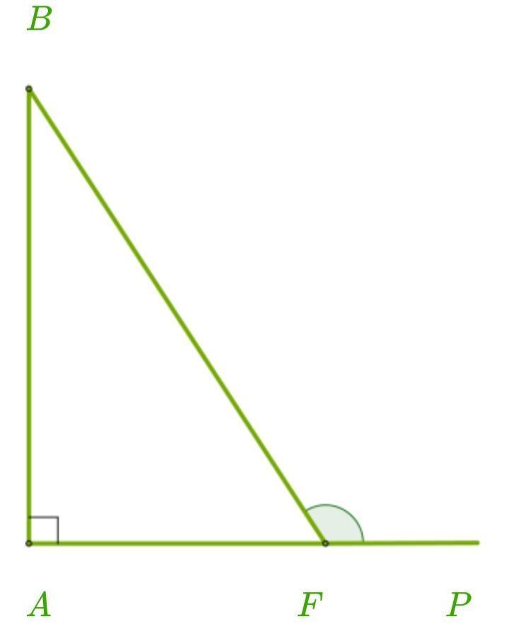 пусть дан прямоугольный треугольник АВF(угол А=90°) ,угол BFP - внешний угол ,смежный с углом BFA, их сумма 180 °