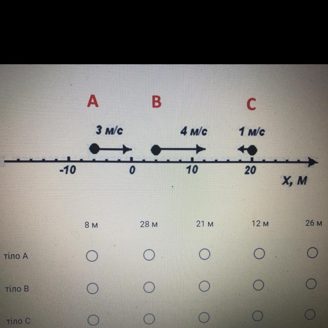 4. Тіло С починає свій рух у точці +20 м. За час 6 секунд воно пройде шлях S = 1м/с • 6с = 6 м. Воно рухається у протилежний бік. Його кінцева координата: 20 - 6 = 14м.