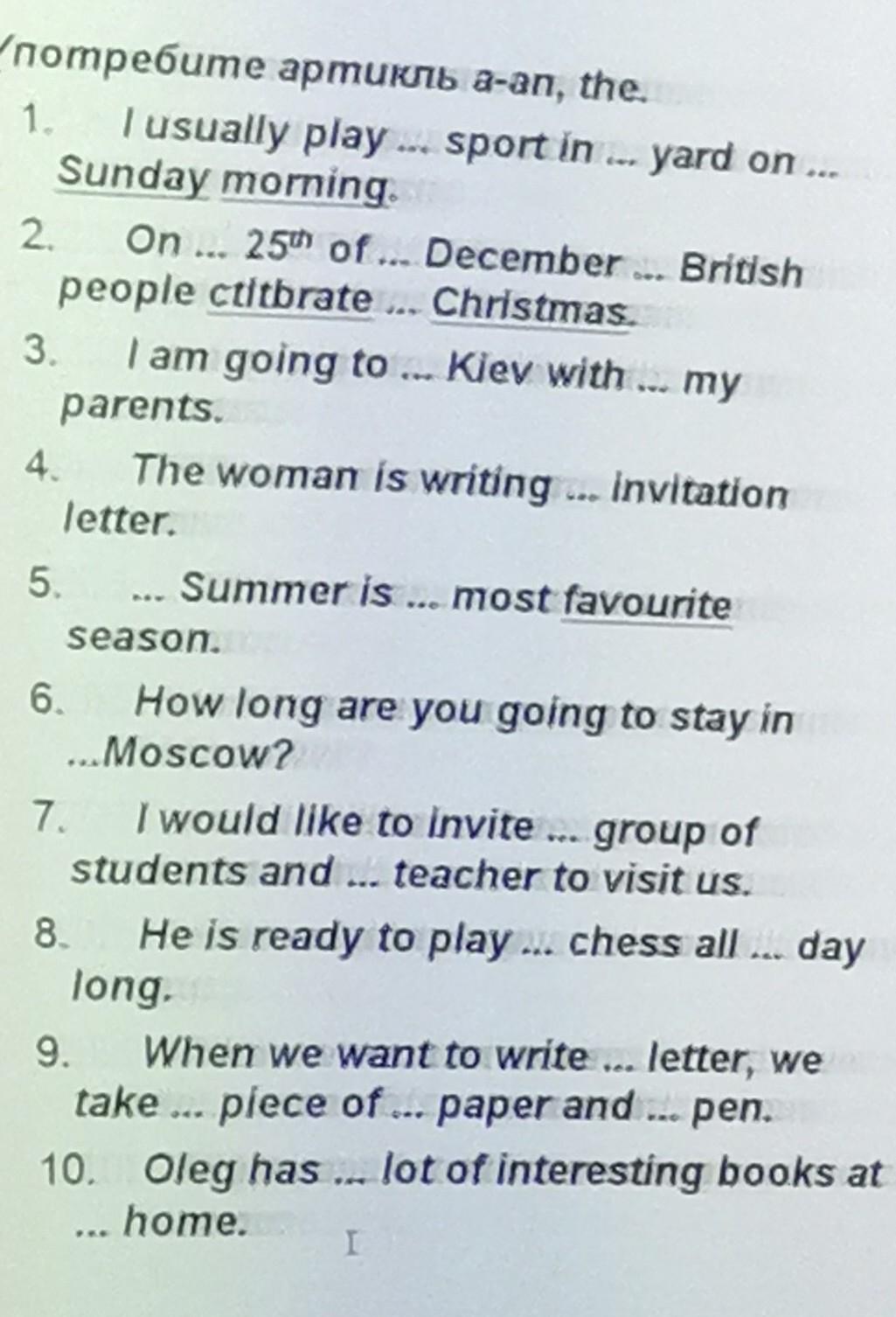 Употребите apmukль a-an, the 1. I usually play... sport in... yard Sunday morning. 2. On ... 25th of... December... Briti people ctitbrate... Christmas. 3. 4. 5. I am going to ... Kiev with... my parents. 6. The woman is writing... invitatio letter. Summer is ... most favourite season. How long are you going to stay ...Moscow? 7. I would like to invite ... group of students and ... teacher to visit us. 8. He is ready to play... chess all long. 9. When we want to write ... letter. take ... piece of ... paper and ... per 10. Oleg has... lot of interesting bo ... home. I