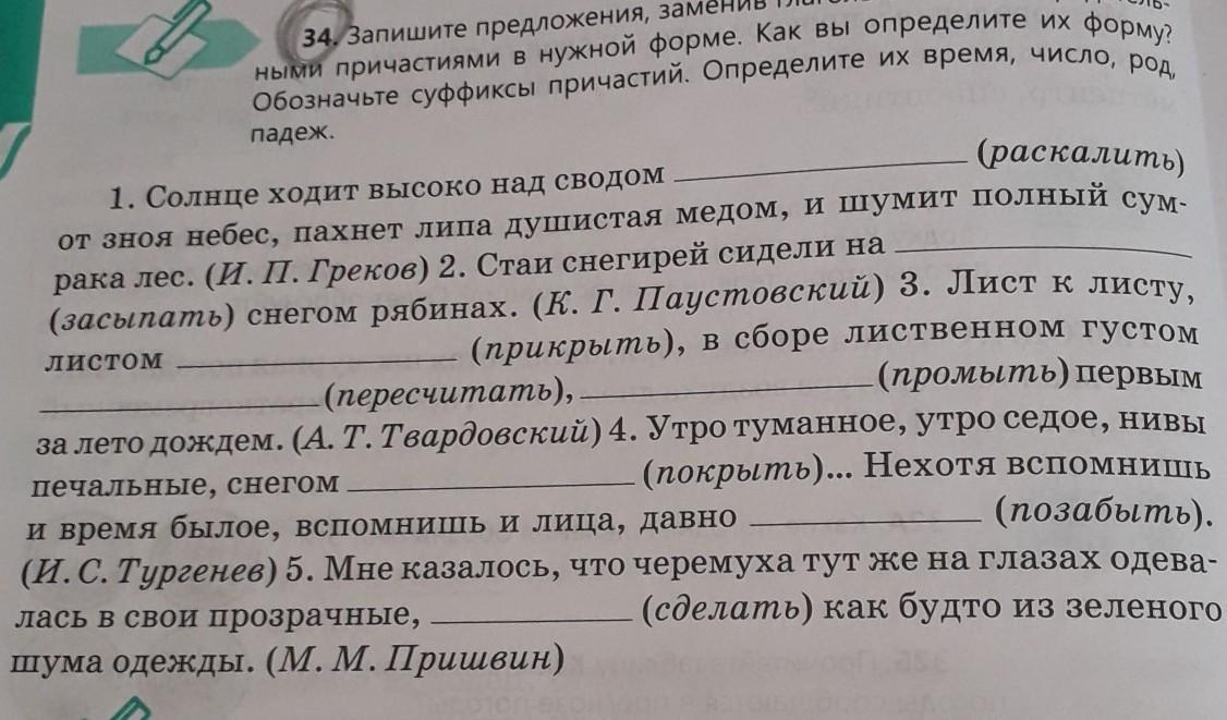 34. Запишите предложения, заменив глаголы в скобках страдатель- ными причастиями в нужной форме. Как вы определите их форму? Обозначьте суффиксы причастий. Определите их время, число, род, падеж. (раскалить) 1. Солнце ходит высоко над сводом от зноя небес, пахнет липа душистая медом, и шумит полный сум- рака лес. (И. П. Греков) 2. Стаи снегирей сидели на листом (засыпать) снегом рябинах. (К. Г. Паустовский) 3. Лист к листу, (прикрыть), в сборе лиственном густом (промыть) первым -(пересчитать), печальные, снегом за лето дождем. (А.Т.Твардовский) 4. Утро туманное, утро седое, нивы (покрыть)... Нехотя вспомнишь (И.С.Тургенев) 5. Мне казалось, что черемуха тут же на глазах одева- лась в свои прозрачные, (позабыть). и время былое, вспомнишь и лица, давно (сделать) как будто из зеленого шума одежды. (М. М. Пришвин)