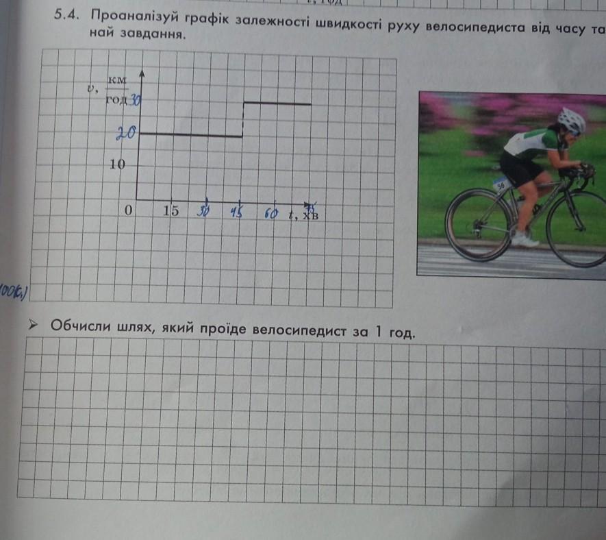 5.4. Проаналізуй графік залежності швидкості руху велосипедиста від часу та вико- най завдання. U, KM год 30 20 10 0 15 30 45