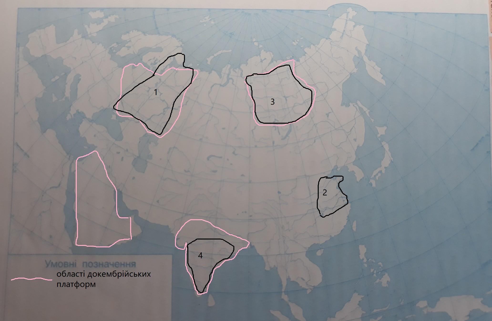 - На контурній карті Євразії , яка дана нижче у додатку, відповідними кольорами позначено області докембрійських платформ.