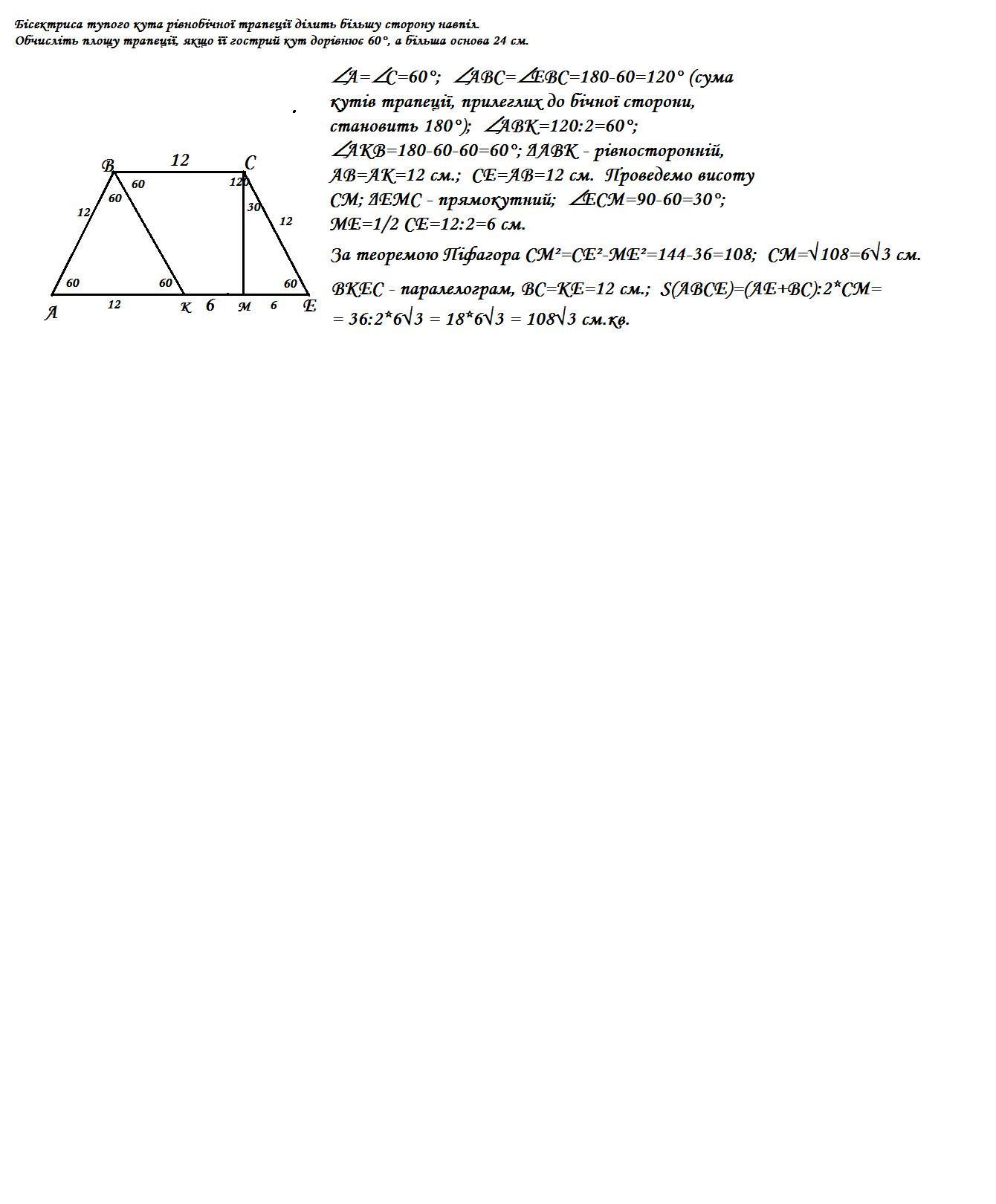 Бісектриса тупого кута рівнобічної трапеції ділить більшу сторону навпіл. Обчисліть площу трапеції, якщо її гострий кут дорівнює 60°, а більша основа 24 см.