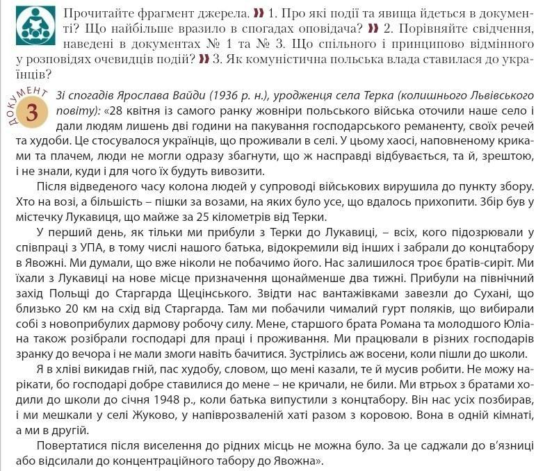 Зі спогадів Ярослава Вайди (1936 р. н.), уродженця села Терка (колишнього Львівського повіту): «28 квітня із самого ранку жовніри польського війська оточили наше село і дали людям лишень дві години на пакування господарського реманенту, своїх речей та худоби. Це стосувалося українців, що проживали в селі. У цьому хаосі, наповненому криками та плачем, люди не могли одразу збагнути, що ж насправді відбувається, та й, зрештою, і не знали, куди і для чого їх будуть вивозити. Після відведеного часу колона людей у супроводі військових вирушила до пункту збору. Хто на возі, а більшість - пішки за возами, на яких було усе, що вдалось прихопити. Збір був у містечку Лукавиця, що майже за 25 кілометрів від Терки. У перший день, як тільки ми прибули з Терки до Лукавиці, - всіх, кого підозрювали у співпраці з УПА, в тому числі нашого батька, відокремили від інших і забрали до концтабору в Явожні. Ми думали, що вже ніколи не побачимо його. Нас залишилося троє братів-сиріт. Ми їхали з Лукавиці на нове місце призначення щонайменше два тижні. Прибули на північний захід Польщі до Старгарда Щецінського. Звідти нас вантажівками завезли до Сухані, що близько 20 км на схід від Старгарда. Там ми побачили чималий гурт поляків, що вибирали собі з новоприбулих дармову робочу силу. Мене, старшого брата Романа та молодшого Юліана також розібрали господарі для праці і проживання. Ми працювали в різних господарів зранку до вечора і не мали змоги навіть бачитися. Зустрілись аж восени, коли пішли до школи. Я в хліві викидав гній, пас худобу, словом, що мені казали, те й мусив робити. Не можу нарікати, бо господарі добре ставилися до мене - не кричали, не били. Ми втрьох з братами ходили до школи до січня 1948 р., коли батька випустили з концтабору. Він нас усіх позбирав, і ми мешкали у селі Жуково, у напіврозваленій хаті разом з коровою. Вона в одній кімнаті, а ми в другій. Повертатися після виселення до рідних місць не можна було. За це саджали до в'язниці або відсилали до концентраційного табору до Явожна».