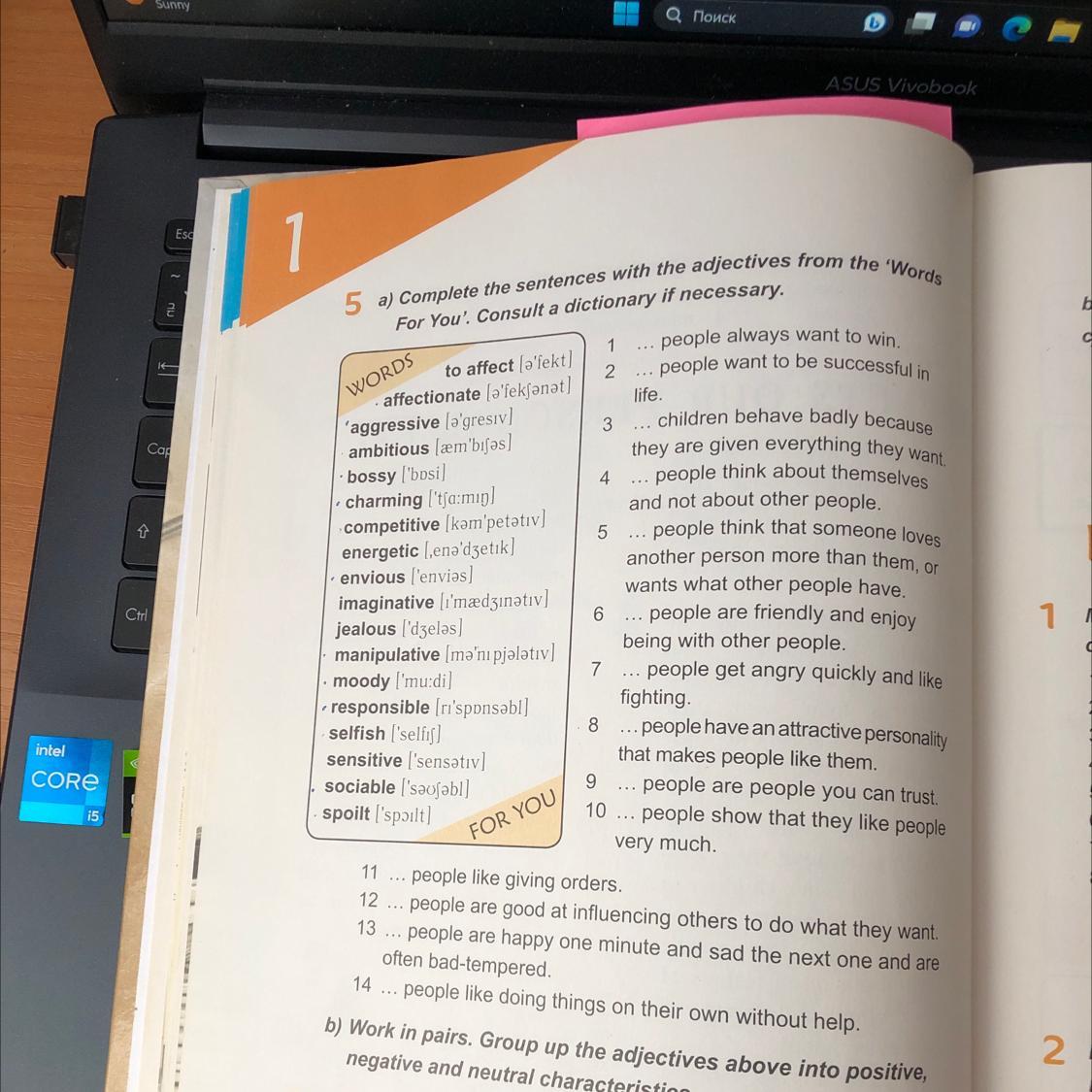 1 competitive 2 ambitious 3 spoilt 4 selfish 5 jealous 6 sociable 7 aggressive 8 charming 9 responsible 10 affectionate 11 bossy 12 manipulative 13 moody 14 energetic (?)
