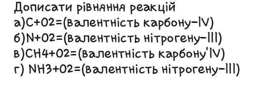 а)C+O2=(валентність карбону-IV) б)N+O2=(валентність нітрогену-III) в)СН4+О2=(валентність карбону'IV)