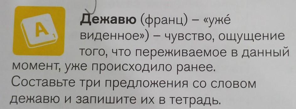 Дежавю (франц) - «ужé виденное») - чувство, ощущение того, что переживаемое в данный момент, уже происходило ранее. Составьте три предложения со словом дежавю и запишите их в тетрадь.